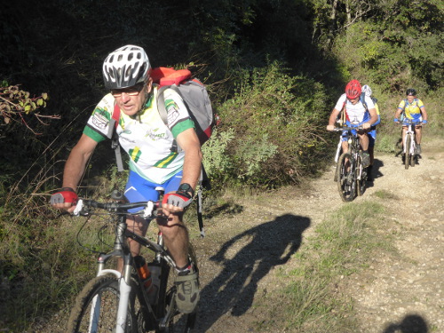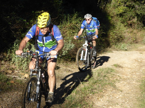 A 14h le casse-croute est avalé, les vélos prêts. Place à l’aventure ! Patrick L. nous a concocté une mise en jambe toute en douceur avec un parcours de 15km et 600 m de D+ mais avec tout de même 7 cols. Dès la sortie du village le vélo de Polo fait des bruits bizarres. Au premier col, il faut se rendre à l’évidence la roue libre est HS. Notre ami va donc devoir finir le circuit en mode « pignon fixe », un exercice pas si facile que ça à VTT !