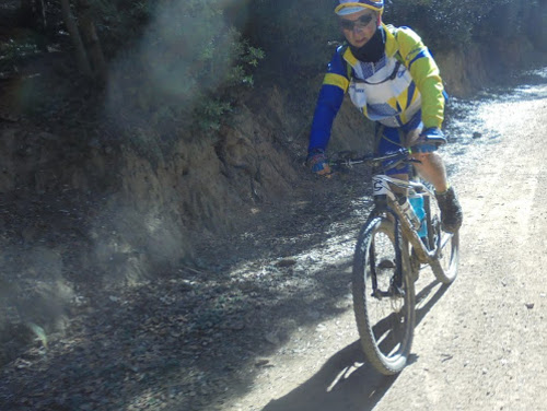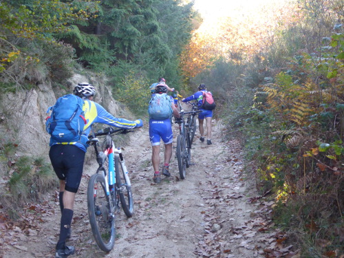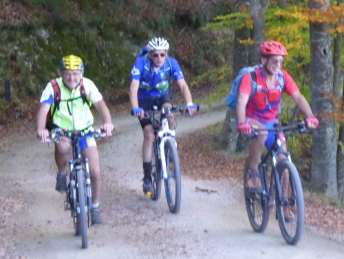 A 14h le casse-croute est avalé, les vélos prêts. Place à l’aventure ! Patrick L. nous a concocté une mise en jambe toute en douceur avec un parcours de 15km et 600 m de D+ mais avec tout de même 7 cols. Dès la sortie du village le vélo de Polo fait des bruits bizarres. Au premier col, il faut se rendre à l’évidence la roue libre est HS. Notre ami va donc devoir finir le circuit en mode « pignon fixe », un exercice pas si facile que ça à VTT !